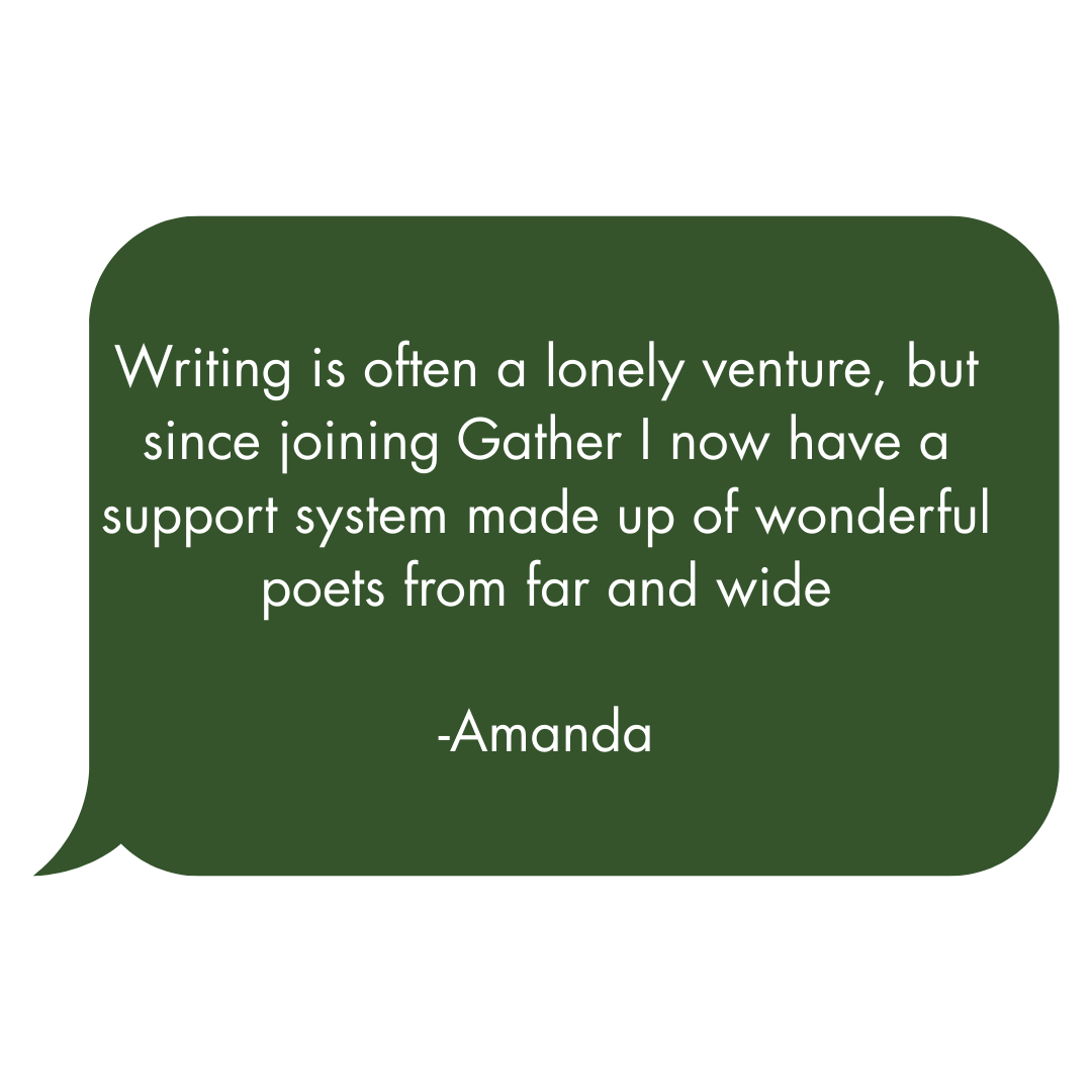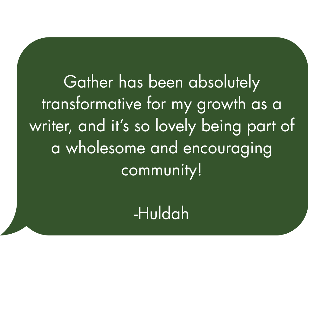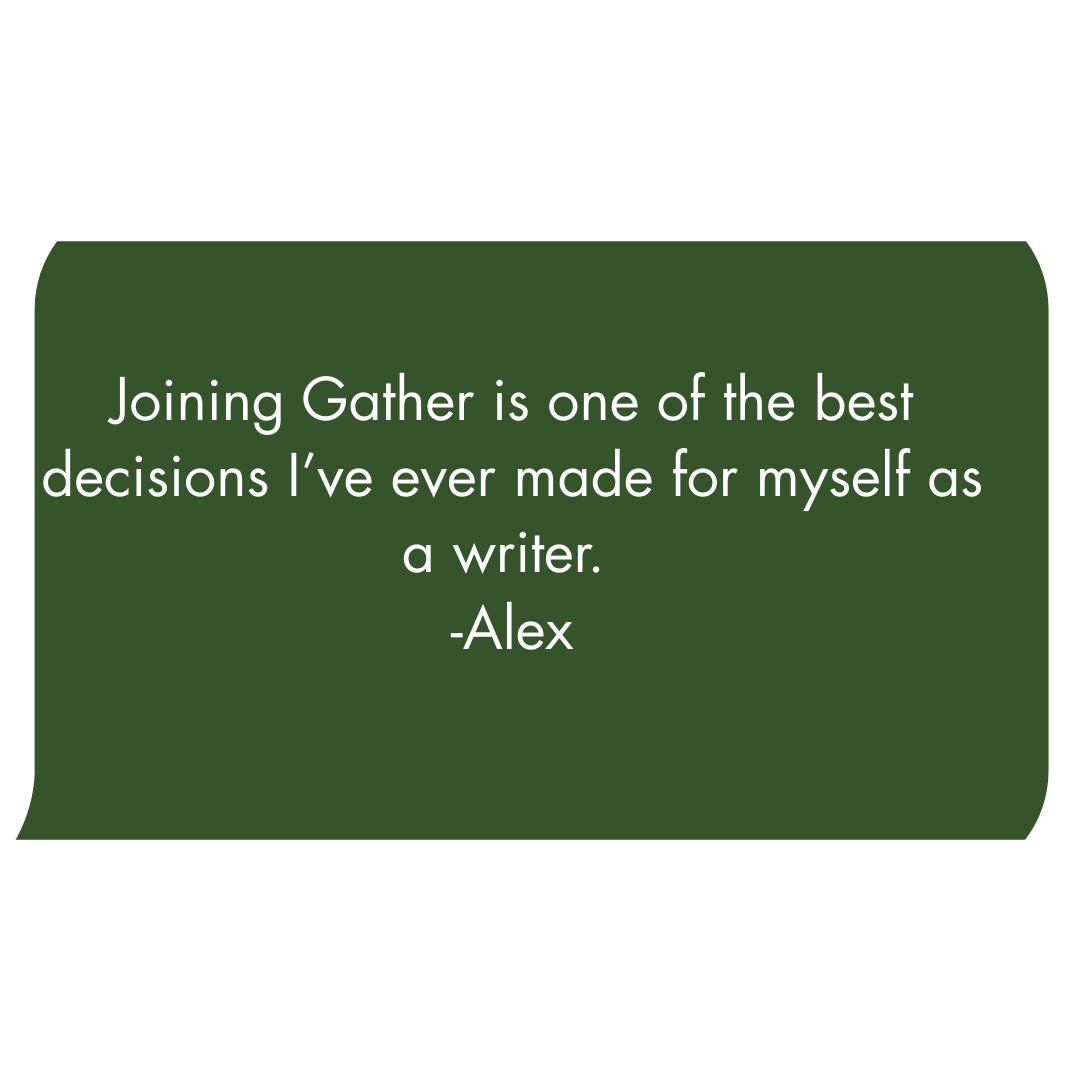 "Finding and joining Gather has been such a joy. Becoming a part of this community has reawakened my love of writing, and the space Maria has created in Gather is so special and so full of support, encouragement, and celebration. I have learned to really embrace and fine-tune my craft and have made amazing connections with fellow writers. I would recommend Gather to anyone, it's been one of the best gifts I've ever given myself!"