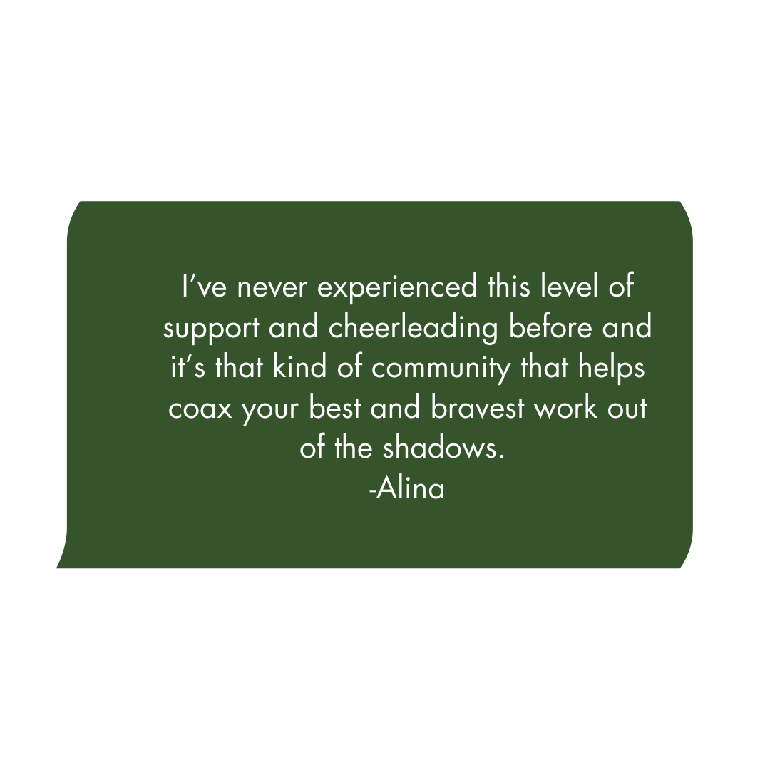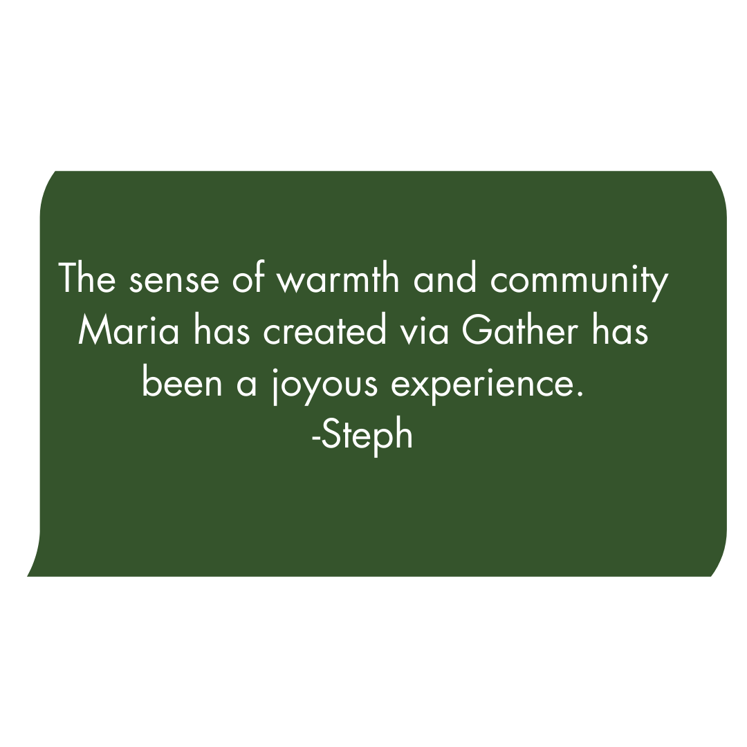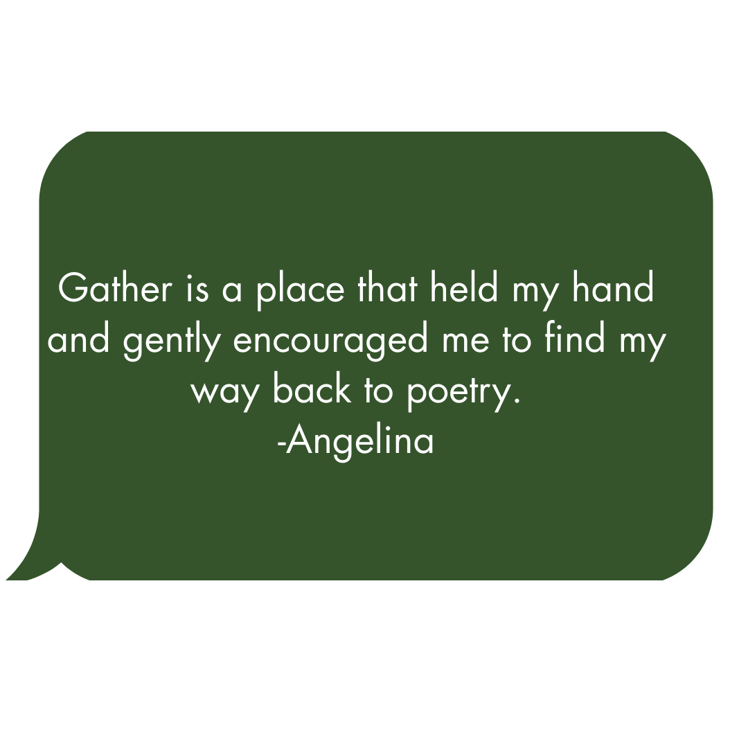 "Finding and joining Gather has been such a joy. Becoming a part of this community has reawakened my love of writing, and the space Maria has created in Gather is so special and so full of support, encouragement, and celebration. I have learned to really embrace and fine-tune my craft and have made amazing connections with fellow writers. I would recommend Gather to anyone, it's been one of the best gifts I've ever given myself!"