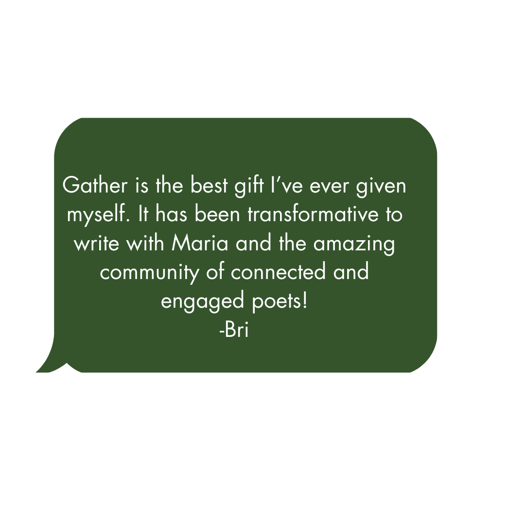 "Maria has been such a pleasure to work with during “Gather”. She includes a brief lesson and prompt at the beginning of each workshop. It is always accessible and inspiring. She truly goes above and beyond for her writers and I feel like I have gained so much more confidence and skill since doing this workshop with her."